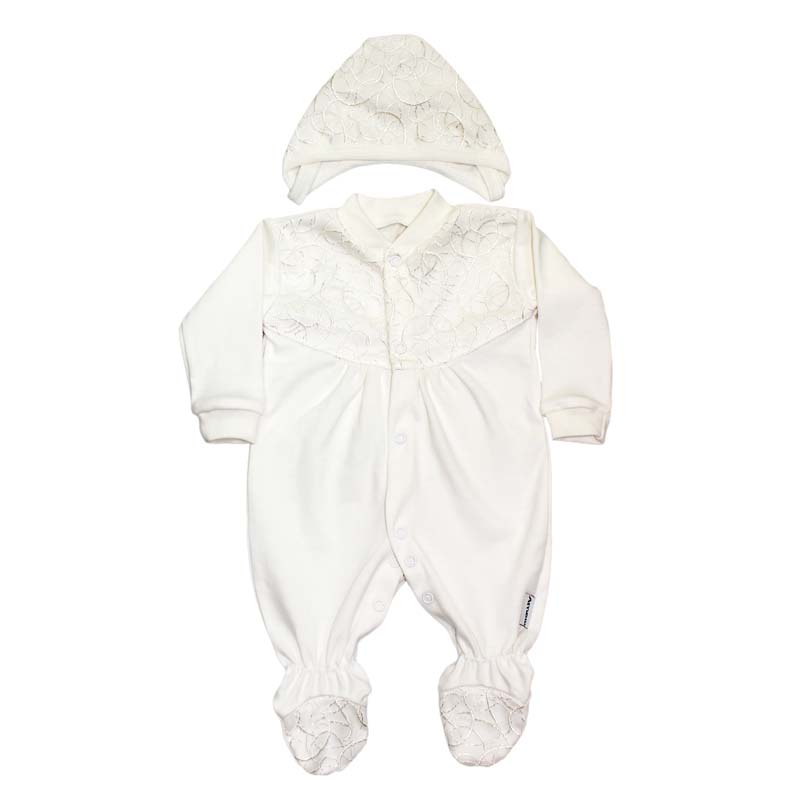 Комплект на выписку: Комбинезон с кокеткой и накладкой "сетка-шитьё" по кокетке и полулапке + чепчик с накладкой "сетка-шитьё"