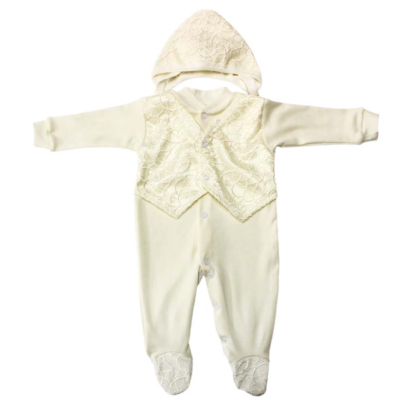 Комплект на выписку: Комбинезон с декоративным жилетом с накладкой "сетка-шитьё" + чепчик с накладкой "сетка-шитьё"