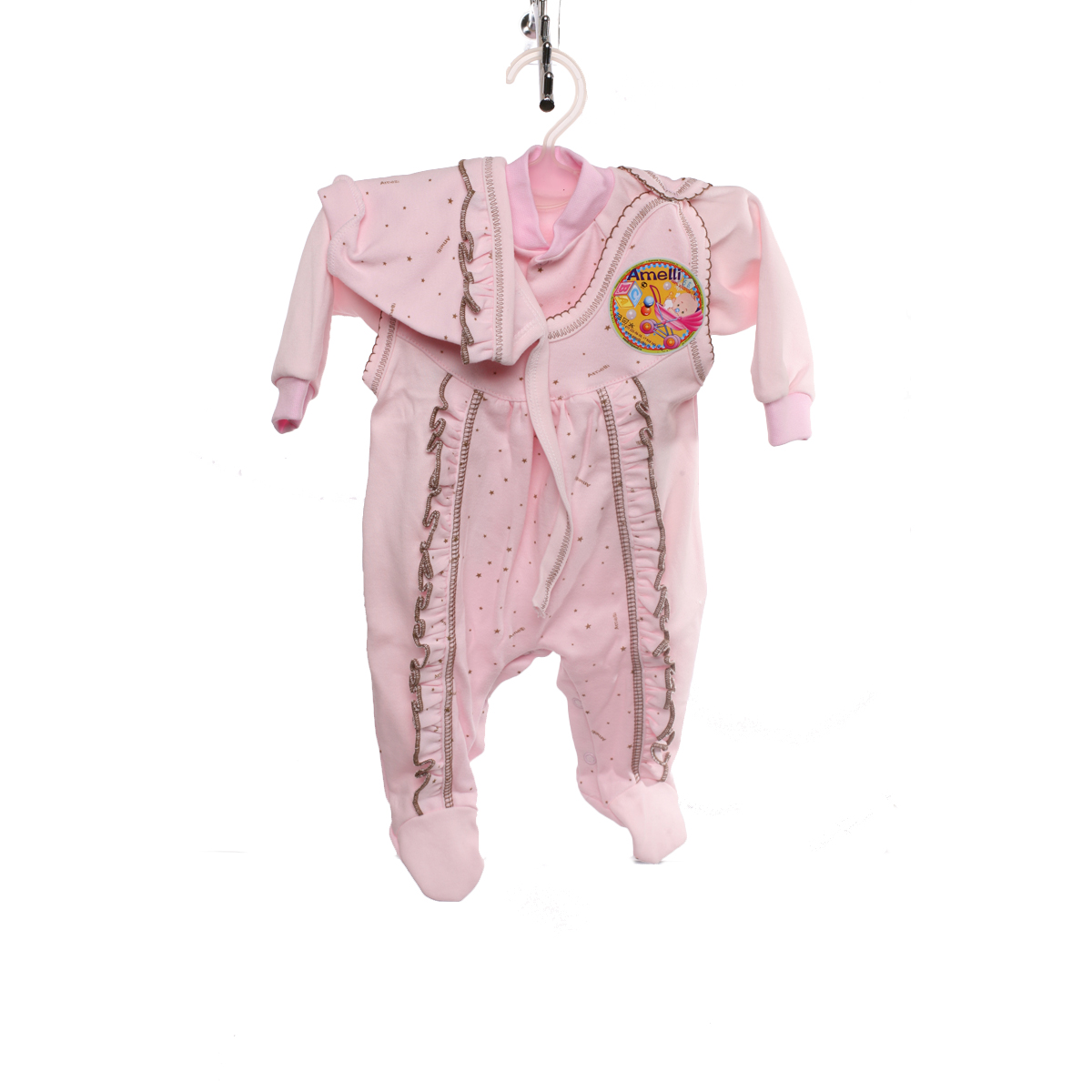 Комплект "Дино", Полукомбинезон, Кофта реглан с длинными рукавами на манжетах, чепчик, обработанные рюшками и укрепляющим отделочным швом в разделениях по вертикали.