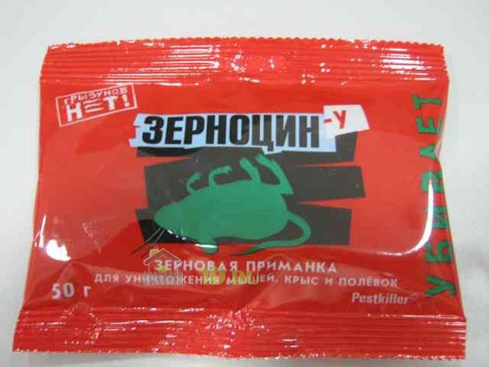 Для борьбы с домовыми мышами, серыми и черными крысами, серыми и рыжими полевками. Срок годности: 12 месяцев со дня изготовления. Упаковка: Пакет 50 гр. Способ примененияЗерноцин помещают в емкости для раскладки отравленных приманок, на подложки, лотки по 20-50 г для мышей и полевок и по 50-100 г для крыс. Лучше всего приманку размещать в специальные емкости (контейнеры), т.к. повышается поедаемость и снижается возможность ее растаскивания грызунами. Емкости и подложки с приманкой размещают в местах обитания грызунов: поблизости от их нор, на путях перемещения, вдоль стен и перегородок. Расстояние между точками раскладки 2-15 м в зависимости от захламленности помещений и численности грызунов. Места раскладки осматривают через 1-2 дня, а затем (при снижении интенсивности поедания приманки) с интервалом 1 неделя. К приманке, которая частично или полностью съедена, добавляют новую. Загрязненную или испорченную приманку меняют на свежую. Емкости с нетронутой приманкой можно перенести в другое место. Работу проводят до исчезновения грызунов. По окончании работ остатки приманки и емкости из-под нее собирают для повторного использования (если они пригодны для этих целей) или для последующего уничтожения. Трупы грызунов собирают для уничтожения. Меры предосторожности и первой помощи при случайном отравленииПриманку применять в местах, недоступных для детей и домашних животных. Во время раскладки приманки не принимать пищу и не курить, желательно применение защитных перчаток. Павших грызунов, упаковку, ёмкости с остатками приманки сжечь или закопать на глубину 0,5 м вдали от водоёмов. После любых работ со средством тщательно вымыть руки тёплой водой с мылом. При попадании средства в желудок пострадавшему следует дать выпить несколько стаканов тёплой воды и вызвать рвоту механическим раздражением задней стенки глотки. Затем дать активированный уголь (10-12 таблеток) с несколькими стаканами воды. После оказания первой помощи срочно обратиться к врачу. До прихода врача исключить всякий прием пищи. При попадании средства на кожу поражённые участки тщательно промыть тёплой водой с мылом. При попадании средства в глаза их следует обильно промыть водой или 2%-ным раствором питьевой соды. Антидот - (викасол или фитоменадион) применяется под медицинским наблюдением. ХранениеВ бытовых условиях хранят при температуре от минус 20 до плюс 40о С, в сухом и темном месте в плотно закрытой таре отдельно от пищевых продуктов, в местах, недоступных для детей и домашних животных.